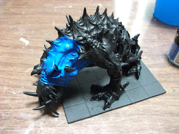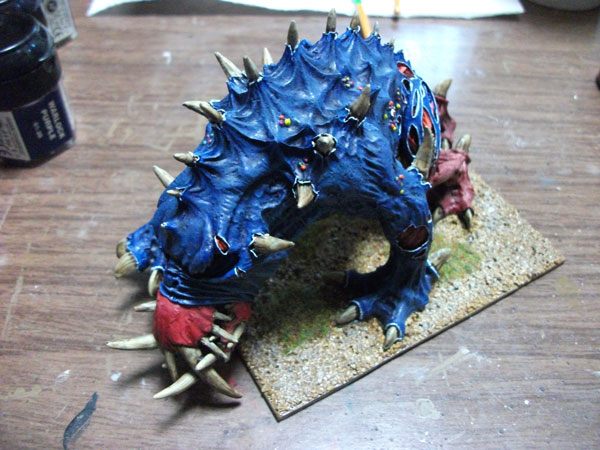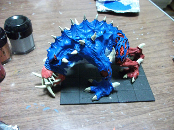 ざっとペイントを施した直後。ここからウォッシュを使ったり、シタデルカラーを薄めたモノでハイライトなどを施していきます。今回は汚し塗装にいつも使っているウォッシュのデブランマッドはトゲと爪、歯など最低限しか使いませんでした。あとは赤と青のウォッシュ、灰色でドライブラシ。ついこの間まで小さいモノを塗っていたので、こういう大きいモノを塗っていると自然とテンション上がりまくります。