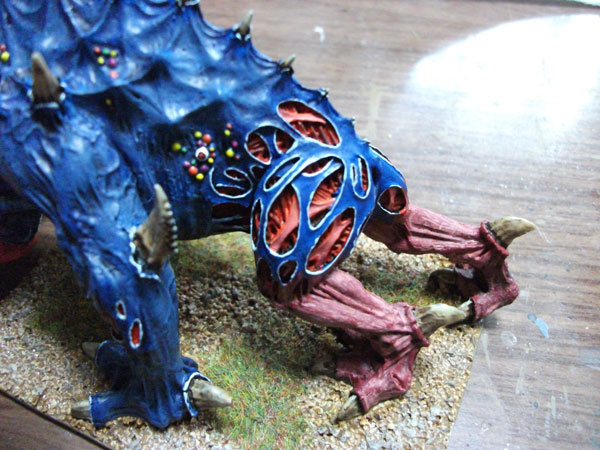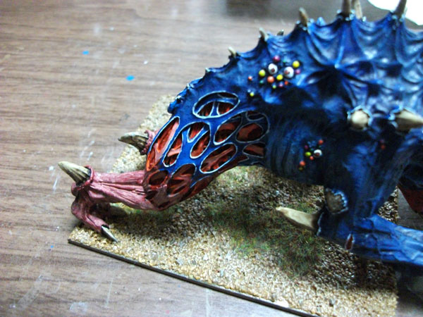右側。カラーリングでお気づきの方もおられると思いますが、今回のペイントはフォージワールドのケイオスドラゴンのペイントを参考に塗ってあります。慣れてきたら、ああいったデカ物にもチャレンジしたいですね。見づらいですが、体のイボに変異で現れた眼をペイントしました。