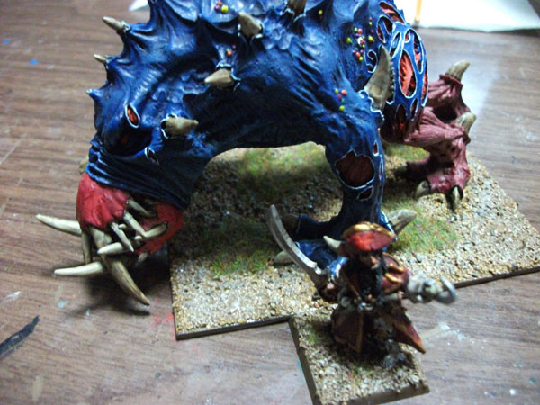 一応コイツには、フォージワールドからPDF形式でダウンロード出来る専用ルールがあるのですが、現在GWJではフォージワールドがサポートされていない事もあって、ホビーセンターなどで開催される公式トーナメントでは使用できません。かといって、大きさ的にこれをスポーンとは言い張れないので、残った選択肢はケイオスジャイアントと言い張るしか・・・まあ、ゲームで使用する為というよりかは、とにかく作りたかったから作ったものなので、このビーストをゲームで運用することはあまり考えておりません。しかしベースはチャリオットベースのサイズを基準に作ってあり、そのままゲームでも使用できる仕様になっているので、MDDの例会やキャンペーンで活躍させてやれたらな、とも思っています。
