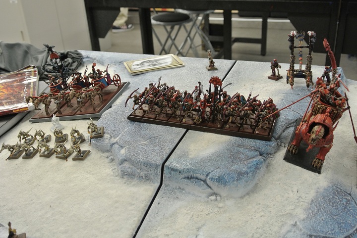 馬蹄と車輪の軋む音に混じる、地響きのような足音。飢餓の森で至宝をソーサラーロードに奪われたとの報告を受けて応援に駆け付けたトゥームキングの一団である。トゥームキングの一団は眼前の渾沌の軍勢こそ、至宝を奪った一団であると判断。すぐさま臨戦態勢に入った。