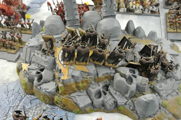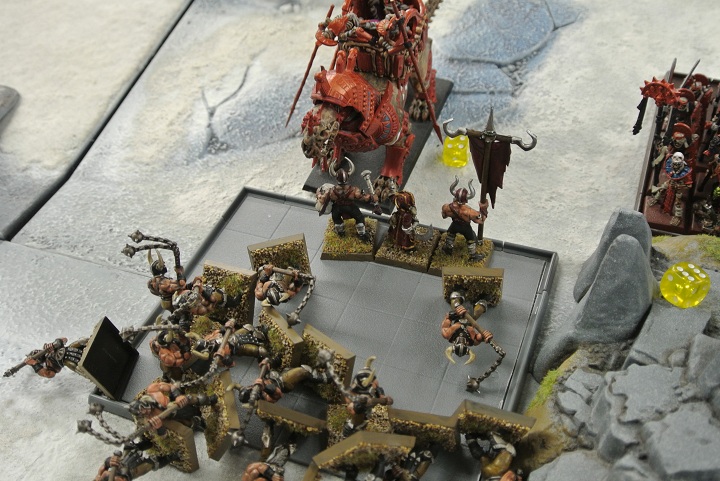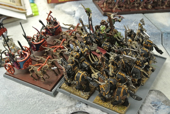 “穢らわしき”カズィークはケイオスウォーリアー達の失態を静かに評し、不浄な獣の腹を蹴り、配下のケイオスナイトと共に迫るスケルトンチャリオットに向けて突貫する。流石はオールドワールドでその悪名を轟かせる不浄の騎士。激情の軍旗を掲げた偉丈夫らはチャリオットを粉砕し、そのまま馬蹄の進むまで進軍を続けた。