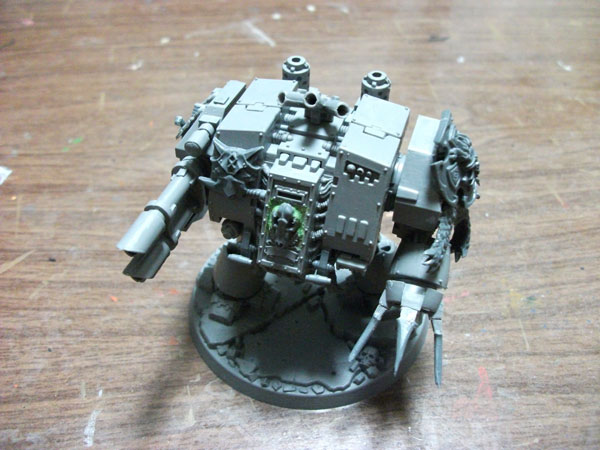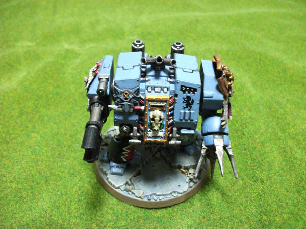 前回のドレッドノートはド派手に作ったので、2号機はロボット物の主人公機みたいな正統派の格好良さを意識して作りました。スペースウルフのコデックスを見ると、スペースウルフのドレッドノートは左手のアームが凶悪なかぎ爪になっているので、マローダーの旗の先端を切り取りアームに接着しました。割としっくりしていて気に入ってます。
