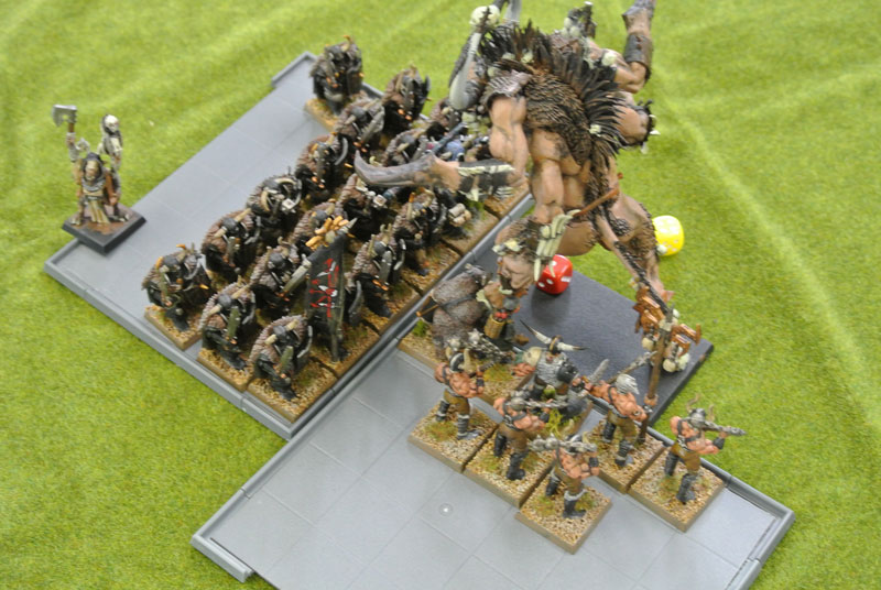 こちらが対戦して下さった方のビーストマン部隊。丁寧なペイントが素晴らしいです。この時一番の驚異だと思っていたのは、ジェネラルが合流しているミノタウロス部隊。このドゥームブル、コンバージョンです。躍動感が素晴らしく非常に格好いいミニチュアでした。