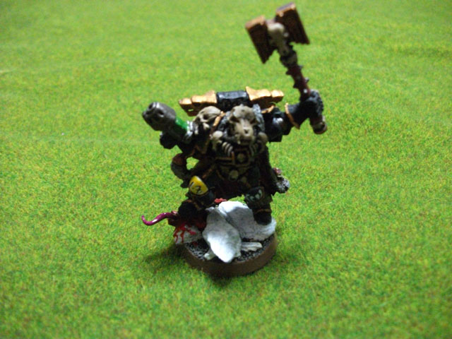 スペースウルフをやるなら、スペシャルキャラクターはンジャルさん!と決めていたので、このミニチュアにはあまり興味はありませんでした。しかしコデックスを読んでみると、この人、無茶苦茶格好いい。傷ついた狼団長を守るために孤軍奮闘したり、狼団長の器があるのにそれを辞退するとか、まさに漢の中の漢。豪傑、という言葉が相応しいオッサンで、非常に気に入りました。なので、ペイントはかなり楽しく出来ました。両足の膝小僧のマーキングは、思ったより上手く出来て気に入っています。
