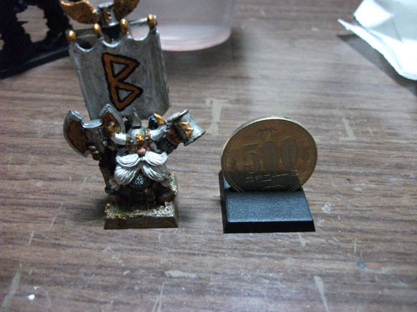 ドワーフは、マジで500円玉と同じサイズです。人間やエルフだと、もう少し大きいはず。ケイオス・ウォーリアの北方人達はもの凄く厳つくでかい設定なので、人間の頭一つ分ぐらい大きいです。暇な時にでも、人間、ケイオス、オーガ並べた画像も作ってみようかな・・・