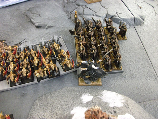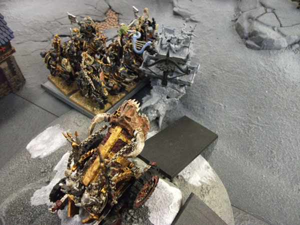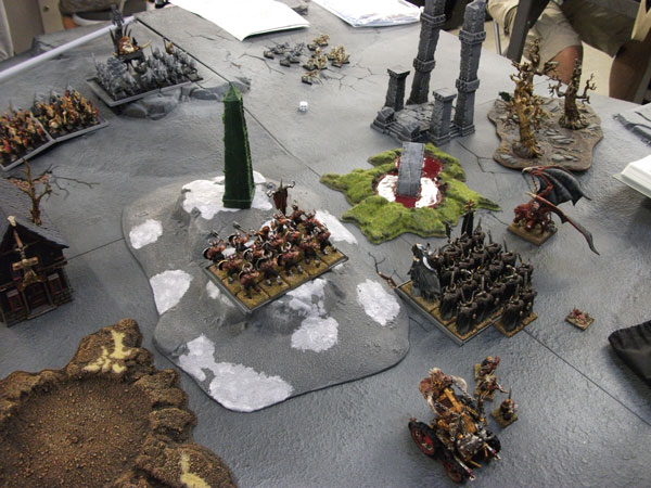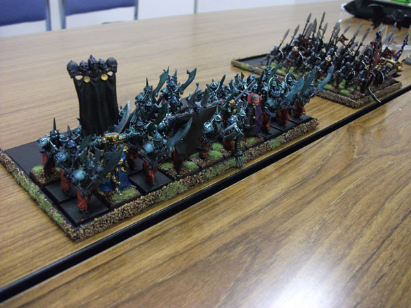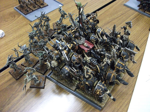 今回の戦績は1勝1引き分け。ヴァンパイアカウントとのバトルは引き分けというより、あきらかにこちらのボロ負けだったのですが(生き残ったのが、ヘルキャノンとケイオスウォーリアーだけ)、『相手の2倍以上の勝利ポイントを獲得しなければ、そのバトル結果は引き分けとする』という8版の新たなルールにより、引き分けになりました。ヴァンパイアカウントは魔法中心の編成ではなく、正面からぶつかる編成でも充分怖い。グレイヴガードのホードとは今回初めて戦ったのですが、横10列の30体編成がプレイヤーに与える視覚的圧迫感と、グレイトウェポン持ちで3列目まで支援攻撃出来る攻撃回数の多さは敵プレイヤーをリアルで恐慌状態に陥れます。1ターンは粘るだろうと思っていたケイオスナイトが1ターン粘ることなく速攻で撤退した時、心が折れた。