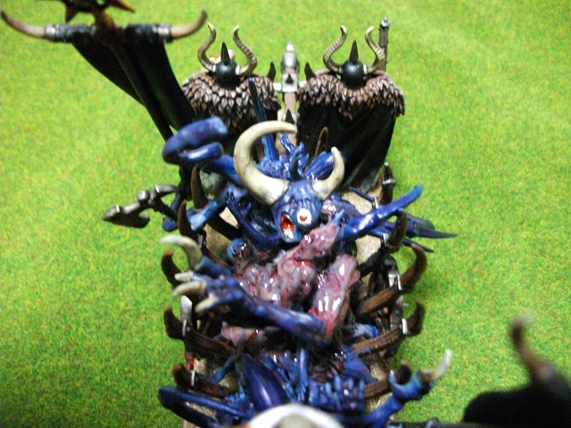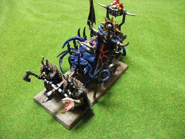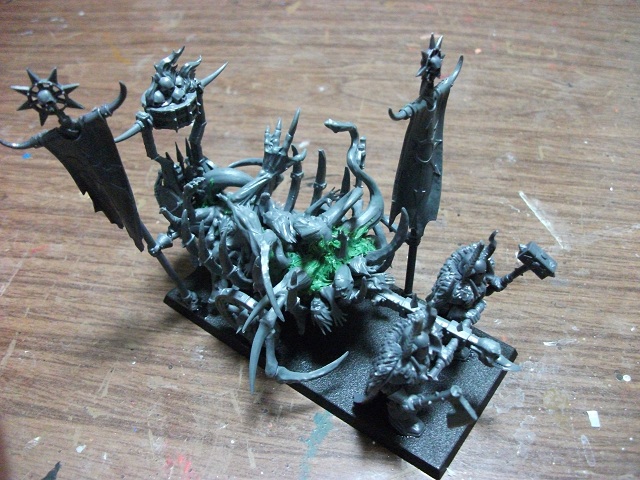 ウォーシュラインは〈禍つ神々〉へ忠誠を示すための供物を捧げる移動式祭壇。元々うちの総大将であるイーサンはあまり信心深い訳ではない(戦い方に惚れられてコーン神の寵愛を受けているという設定)ので、どういう祭壇を作ろうか悩んでいたのですが、色々コープス・カートに乗っかったゾンビの皆さんを弄くり回して居たらなんとなくディーモンっぽくなったので、グレーターディーモンの残骸を運んでいるという設定にしました。