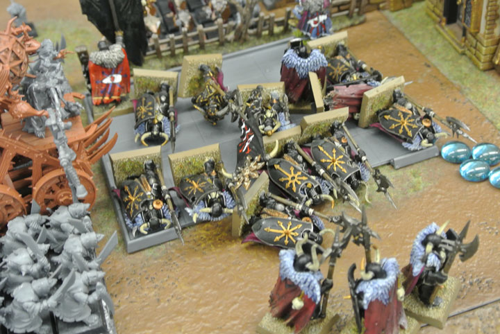 プレーグファーネスと共に進軍してきたプレーグモンク達に側面を取られ、ケイオスウォーリアー部隊は瓦解した。彼らの鋭い前歯は堅牢なケイオスアーマーさえも貫き、肉片を一切残さず彼らの餓えを満たす糧食へと成り代わる。サマンスレイヴは鼠人間共の隙を突いて脱出する事に成功したが、彼の部下は残さず彼らの胃袋へと収まった。