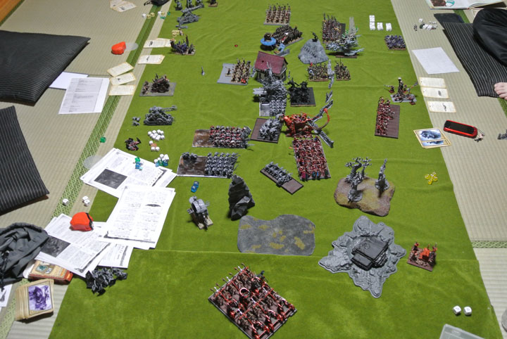 まずは夕食前に、ということでプレイマットを広げて1500ポイント戦を行いました。自分は北(トカゲ)さんの新アーミーネズミ人間のスケイブンとバトル。1ターン目にウォーシュラインの効果で“神々の御力はここにあり!”がティーンチ神の加護をうけたケイオスウォーリアーに備わり、『鋼鉄の意志』と『ワードセーヴィング3』の超絶に硬いケイオスウォーリアーが誕生しました。この甲斐あって、このバトルはWoC側の勝利!連敗を食い止めました!!(笑)8版になってから我が軍のケイオスウォーリアーが活躍したのは始めてかもしれない・・・・・・