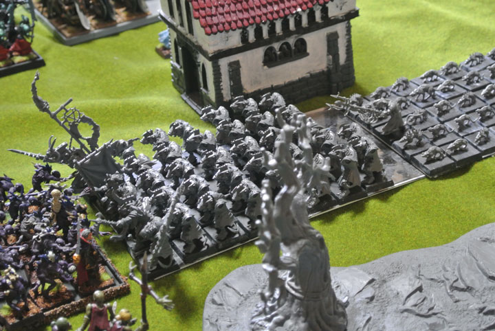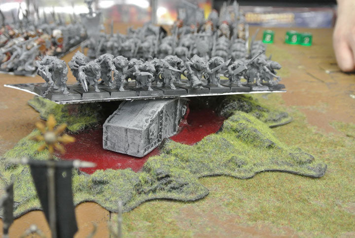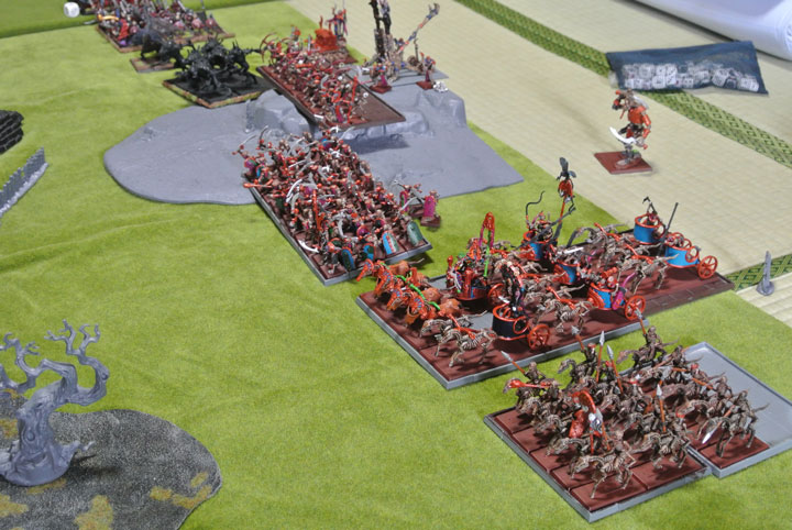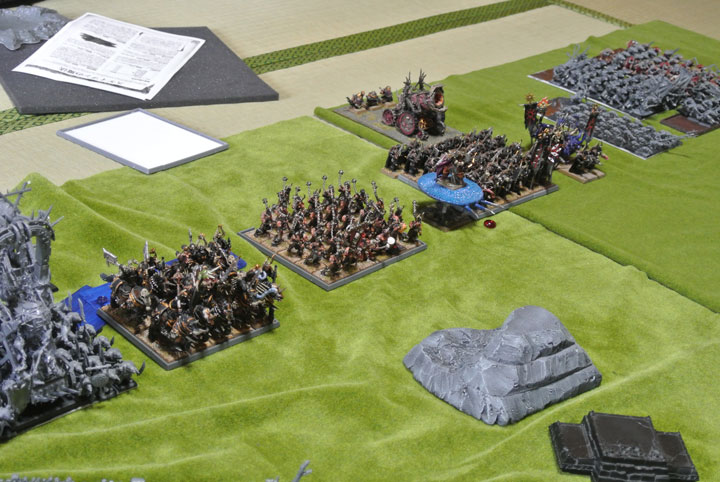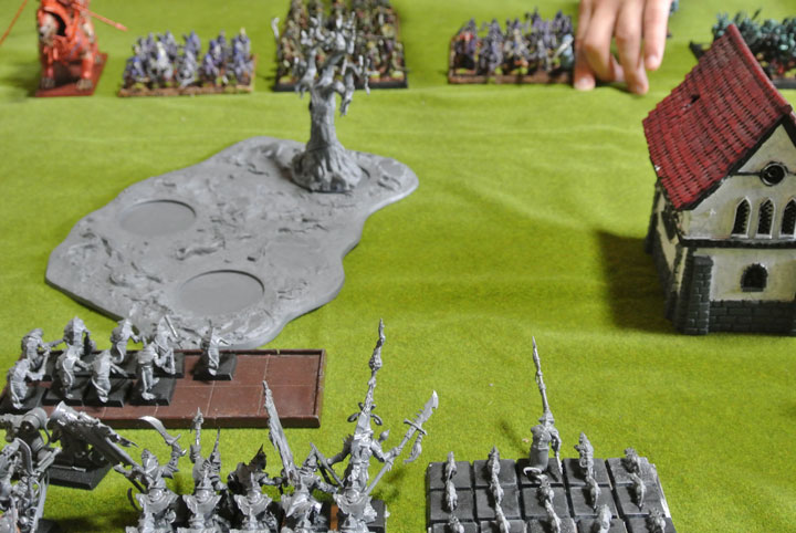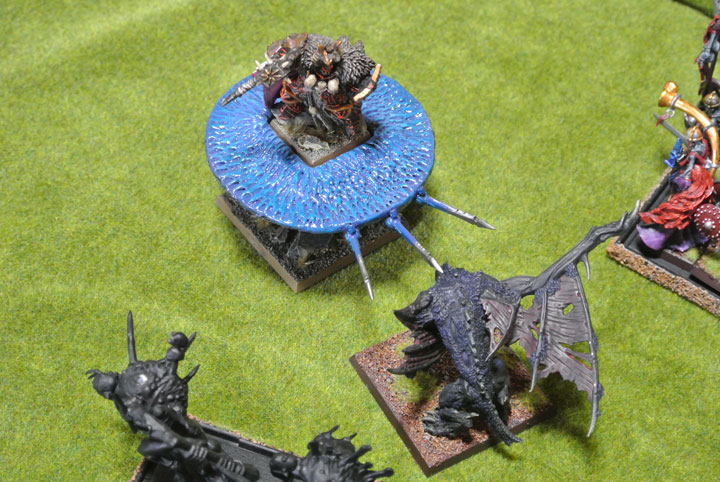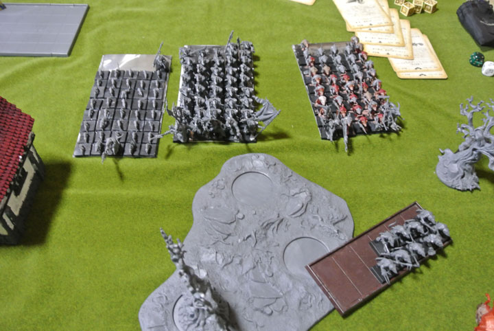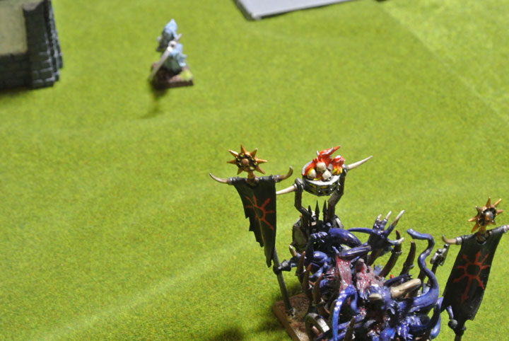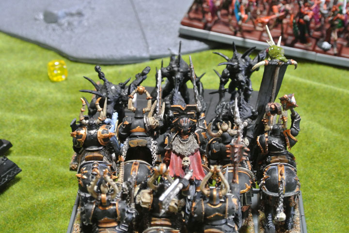 改訂したことにより、WoCは“キャラクターは自分と同じ烙印のユニット以外合流できない”というルールが追加されたのですが、それが今回結構響きました。ナーグル、ティーンチ、スラーネッシュとケイオスウォーリアー達の烙印をバラバラに編成した為に、ユニットが崩壊しても合流できない!単独でうろついていた(正確にはコマンドグループだけ生き残っていた)イーサンが“角ありし鼠の呪い”によって消滅。こういう事態にならない為には、ある程度烙印を統一させておくべきと身を以て体感しました。もっとも、あの時点で“角ありし鼠の呪い”を喰らった場合、他のユニットに合流していてもイーサン含めて全滅したのですが・・・・・・恐るべし13番目のスペル!