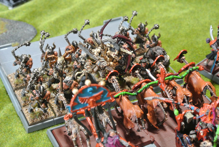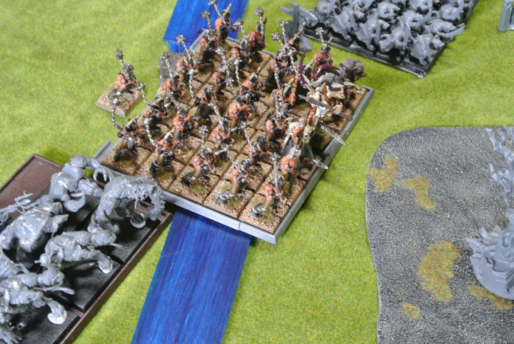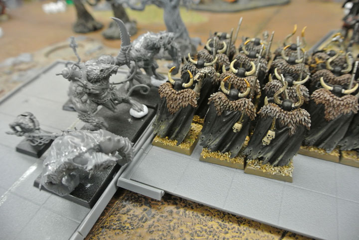 スケイブンスレイブを盾にするように、パックマスターとラットオウガが進軍を始めた。この獰猛な戦闘獣は、悪鬼の如き力で瞬時に敵を肉塊へと変貌させてしまう。彼らは常に血に餓えてており、攻撃対象は敵味方の区別が無い。ラットオウガにとって、肉塊へ変貌した存在が須く“敵”なのだ。