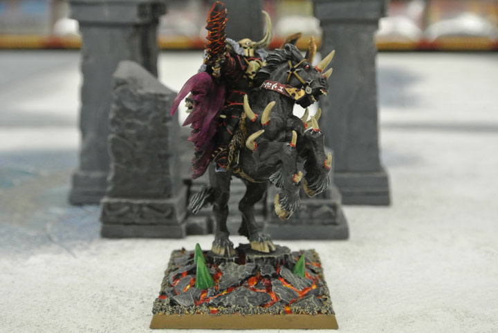 うちにはそっくりさん(徒歩アーケィオン)のイーサンが居たので、なかなか作れずにいました。作る前は、正直他のケイオスロードに比べて地味なんじゃないかなー、角が御大将っぽくないよなーとか、文句ばかり言っていましたが、作ってみると流石は渾沌軍の総大将!制作中にものすごい凄味が、メタルから伝わってきました。カラーリングはオリジナルでやる予定だったのに作例をお手本にしてしまうぐらいに。だがこの後、アーミーブック改訂で新たなカラーリングに生まれ変わろうとは、この時は全然思わなかったのです・・・・・・