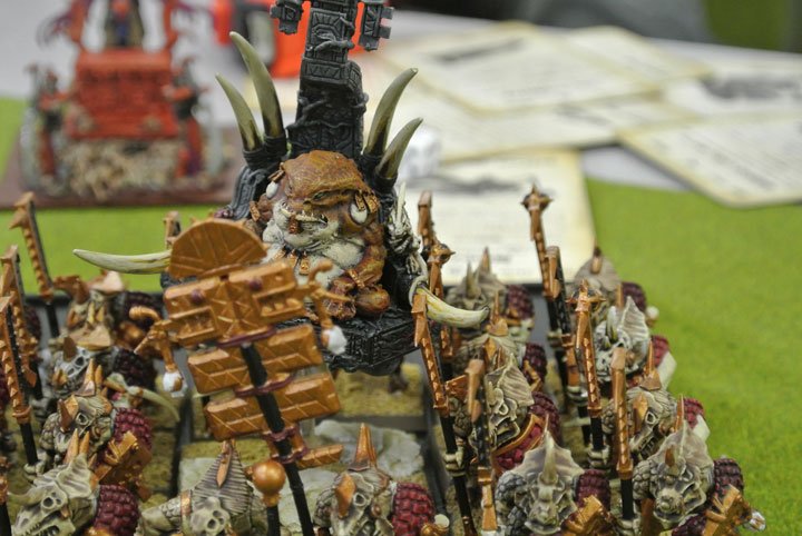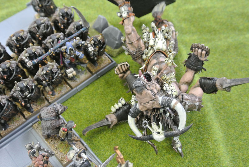 こちらが対戦して下さった方のビーストマン部隊。丁寧なペイントが素晴らしいです。この時一番の驚異だと思っていたのは、ジェネラルが合流しているミノタウロス部隊。このドゥームブル、コンバージョンです。躍動感が素晴らしく非常に格好いいミニチュアでした。