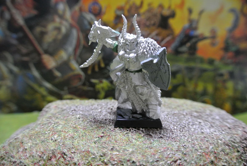 イメージはホビージャパンから出ているウォーハンマーの小説『渾沌のエンパイア』に登場するレイヴン・ホストのケイオス・ロード。あのケイオスロードにはイラストがないので完全に自分の想像なんですが、こんな感じなのではないかなーと思いながら作っていました。というか、これ出来上がった後に『渾沌のエンパイア』を読み返して、描写とか見直すと自分の想像と全然違って非常に困った。武器はグレイブで、マントはカラスの羽根。おまけに、角と角の間に巨大な単眼が浮いているらしい。今からこれを全部再現するのは難しいので(特に単眼)、雰囲気のエッセンスだけイメージに投影して制作したということにしてください(笑)。あと、これの初読時に“グレイブ”を“グレイトウェポン”と脳内変換してしまった俺に幸あれ・・・・・・