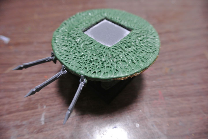 作り方は非常に簡単。フライングベースに固定した小テンプレートにひたすらグリーンスタッフを盛って、水に濡らしたスパチュラで形を整えていく。それだけ。完全に円形なので前後の区別を付けるべく、前方にケイオスナイトのランスを取り付けました。中央のくぼみはイーサンをセットするためのものです。