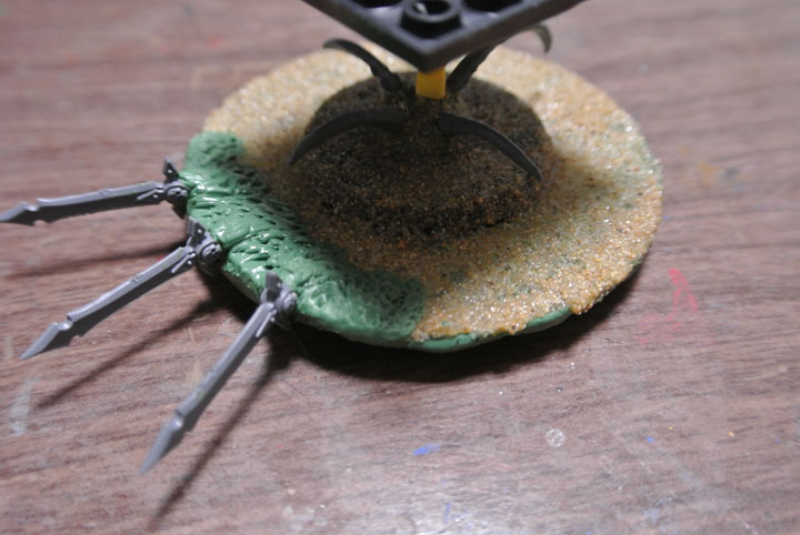裏側はこんな感じになってます。予想以上にグリーンスタッフを消費したので、裏面は一部グリーンスタッフですが、大部分はボンドを塗ってサンドを撒いて作っています。そのままテンプレートむき出しにせずサンドを撒いた理由は、元々地面にスライム状の存在が同化してディスクになるというアイデアだったのと、この小テンプレートの素材が不明であり、万が一ABS樹脂製だった時に断裂阻止する為のコーティングの役割を果たしています。まあ、本当にABS樹脂だったらこの程度のコーティングは多分焼け石に水だろうけど・・・・・・