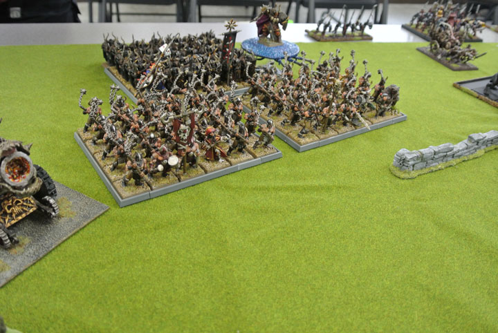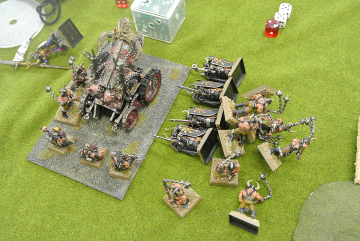 高名なるトゥルクコォルは戦場を飛び交う思念のノイズから、この戦いに“禍つ神々”の邪な思惑が介入していることを感じ取り、真っ先にエインシェント・ステガドンをヘルキャノンへ差し向けた。ディーモンの魂が閉じ込められたヘルキャノンを基点として、大勢のディーモン共が《渾沌の領域》から召喚される危険性を潰す為だ。しかしいかに歳経たエインシェント・ステガドンとはいえ、巨大な鉄の塊であるヘルキャノンを破壊するのは難しい。ヘルキャノンの中に束縛されたディーモンの魂は猛り狂い、操者であるケイオスドワーフたちの命令を無視し、その顎をエインシェント・ステガドンに突き刺した。だがし、ヘルキャノンの顎は分厚いエインシェント・ステガドンの皮膚を貫く事が出来ず、二つの巨獣の凄惨なる対決は決着が付く事無く膠着状態に陥った。