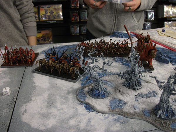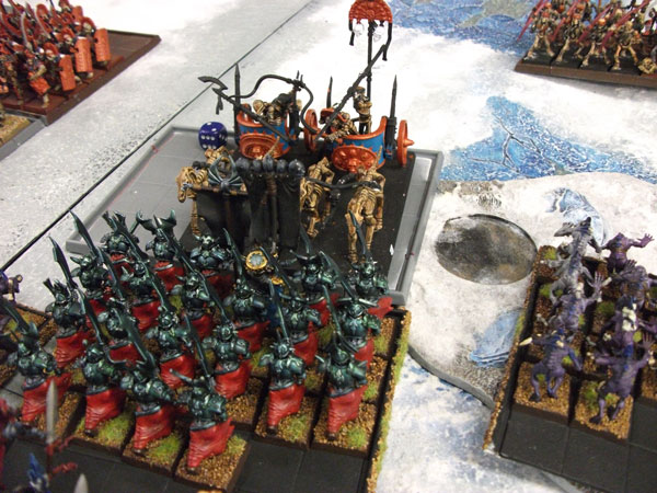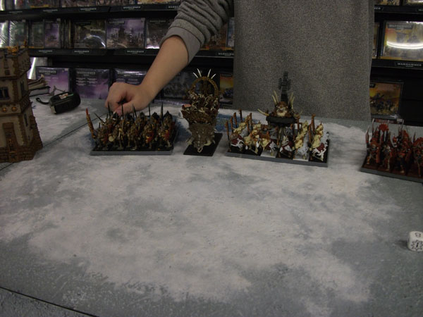 馬蹄と車輪の軋む音に混じる、地響きのような足音。飢餓の森で至宝をソーサラーロードに奪われたとの報告を受けて応援に駆け付けたトゥームキングの一団である。トゥームキングの一団は眼前の渾沌の軍勢こそ、至宝を奪った一団であると判断。すぐさま臨戦態勢に入った。