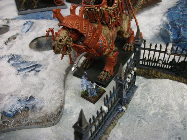 “穢らわしき”カズィークはケイオスウォーリアー達の失態を静かに評し、不浄な獣の腹を蹴り、配下のケイオスナイトと共に迫るスケルトンチャリオットに向けて突貫する。流石はオールドワールドでその悪名を轟かせる不浄の騎士。激情の軍旗を掲げた偉丈夫らはチャリオットを粉砕し、そのまま馬蹄の進むまで進軍を続けた。